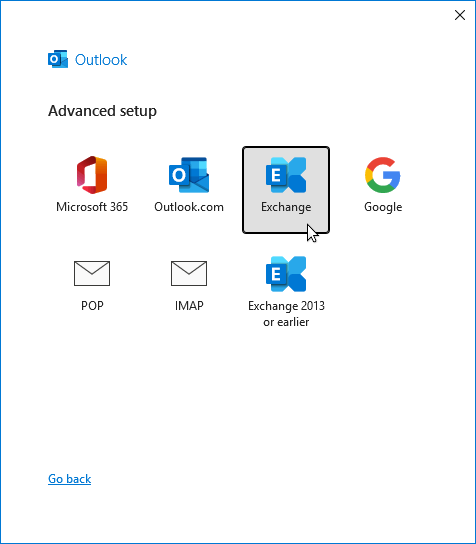 Outlook searches for server information and, if found, requests the account type. Select "Exchange" type: