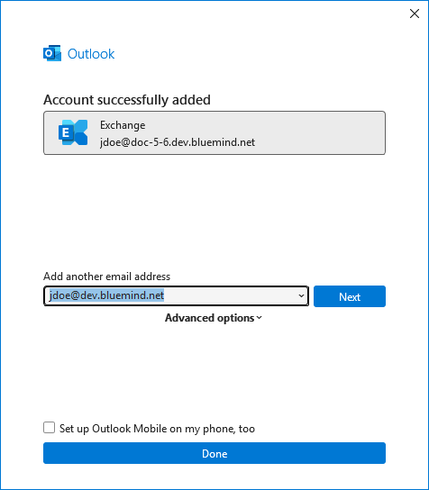 At the current stage of MAPI protocol implementation in BlueMind, the created Outlook profile cannot be used to connect to another Exchange account.
