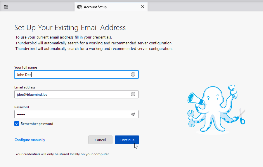 Enter the name, e-mail address and password required to connect to the BlueMind server, then click "Continue":