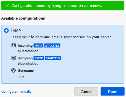 Thunderbird tries to connect to the server using this information, then displays the information found and validated :
