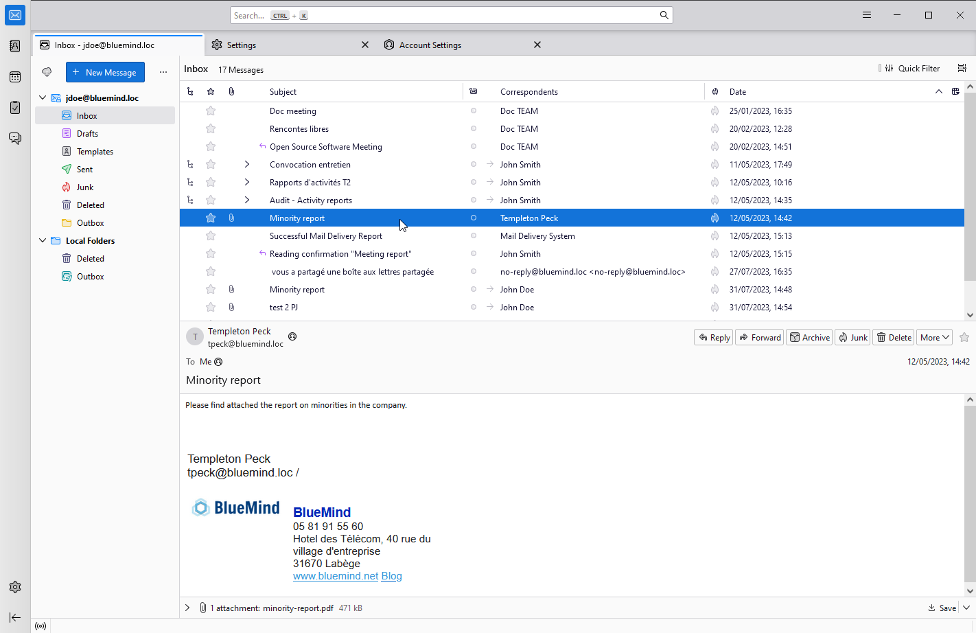 BlueMind gives Thunderbird users the ability to manage all their BlueMind preferences from within their software, without having to visit the BlueMind web application.