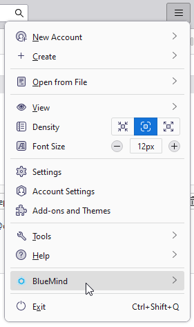 A new menu has also been added to Thunderbird's "sandwich" menu in the window's title bar, giving access to the various BlueMind-specific functions (applications, preferences, synchronization):