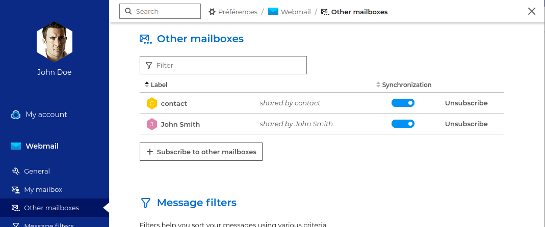 All you have to do is log in to your BlueMind account from a browser, then go to your account's Preferences > Mail > Other mailboxes section: