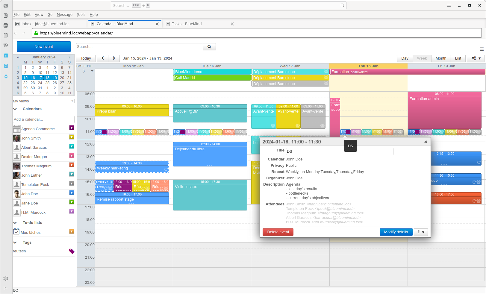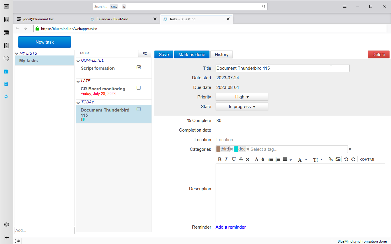 Like the calendar, task management is accessible via a new dedicated button. It opens in its own tab, with the same interface as BlueMind web application: