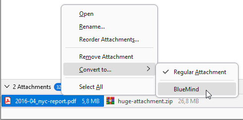 To detach a file already attached to the email (by drag-and-drop, for example), right-click on the attachment name and select Convert to > BlueMind: