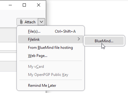 A file can be directly linked to the email using the dedicated menu: click on the arrow of the "Attach" button to pull down the options menu and choose File Space > BlueMind: