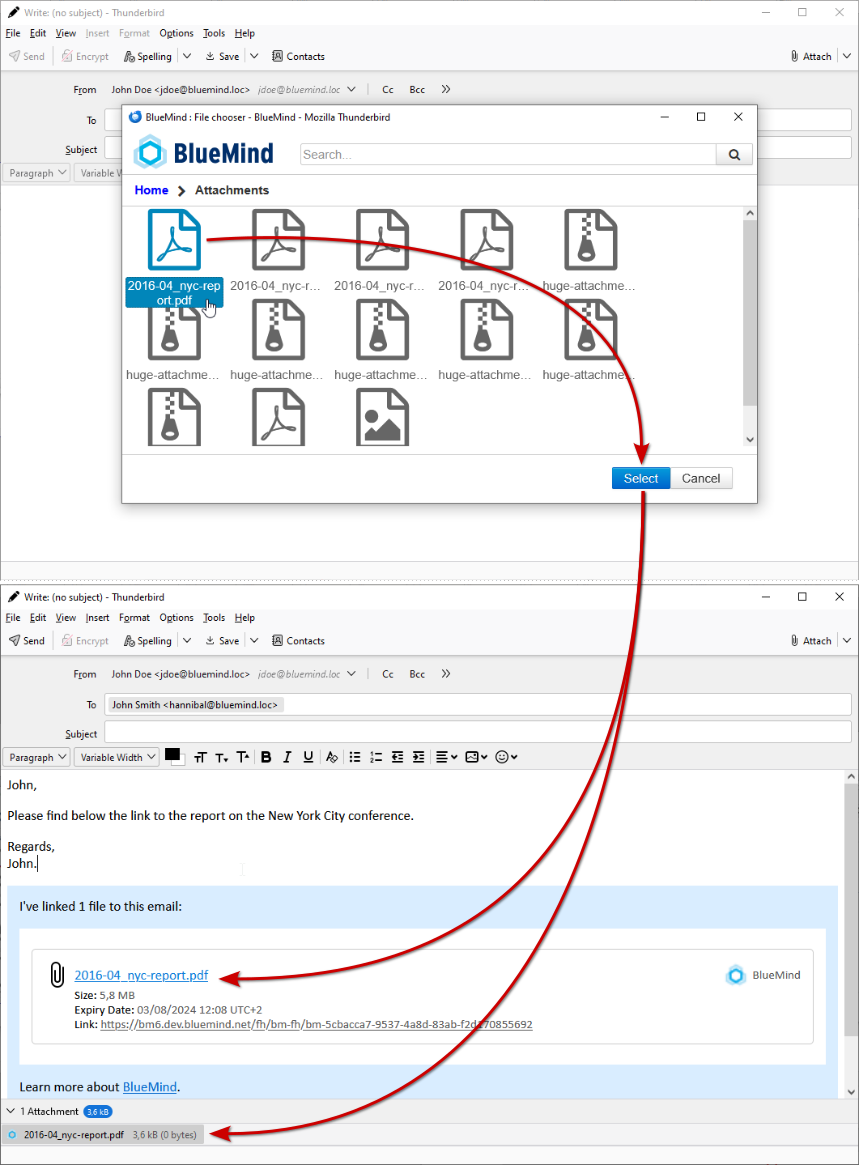 The BlueMind file selector opens, allowing you to select available files. Click on a file and then on the "Select" button to add it to the email: