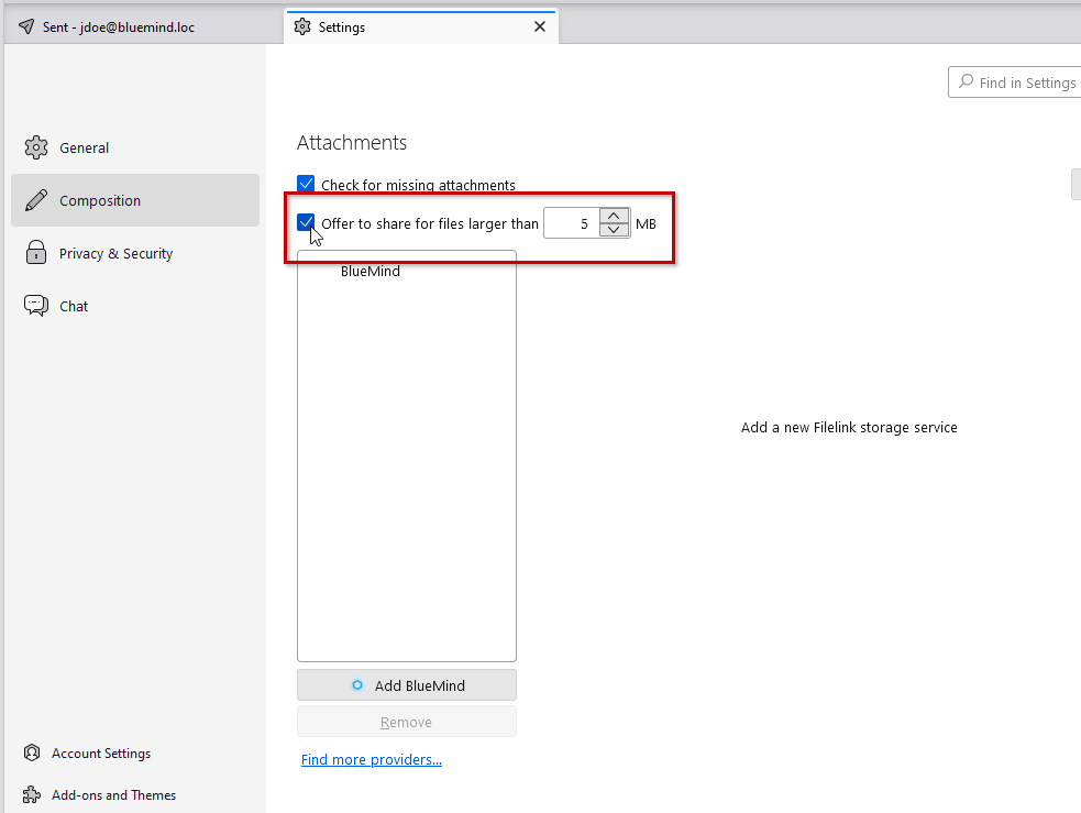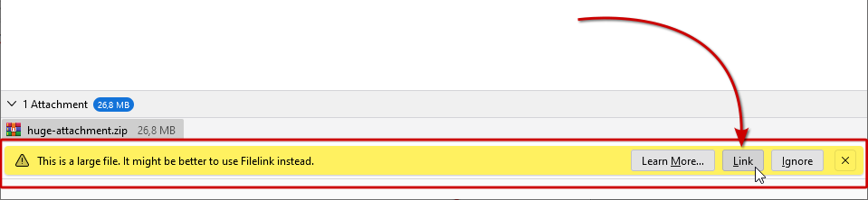 Simply add your attachment in the usual way (using the dedicated button or drag & drop). If its size exceeds the automatic detachment threshold set in BlueMind, Thunderbird will offer to detach the file: