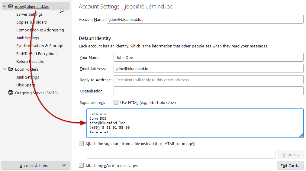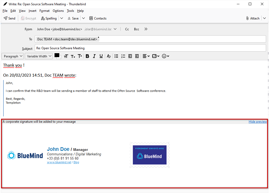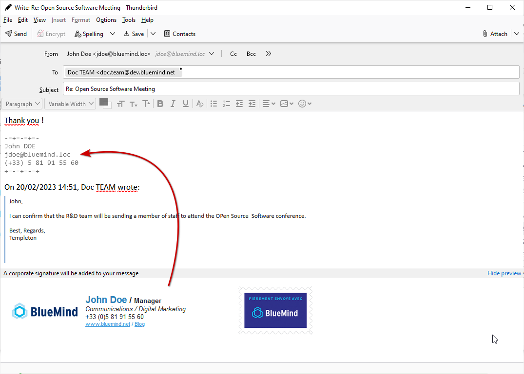 Unlike webmail, BlueMind cannot detect an unmarked personal signature when using Thunderbird. So if a personal signature is used in Thunderbird, the corporate signature will be added to it.