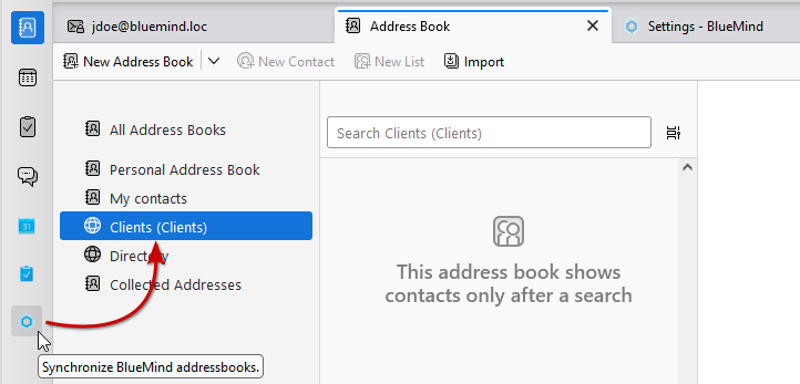 Click the "Synchronize" button or use the hamburger menu > BlueMind > Synchronize. The adressbook then appears: