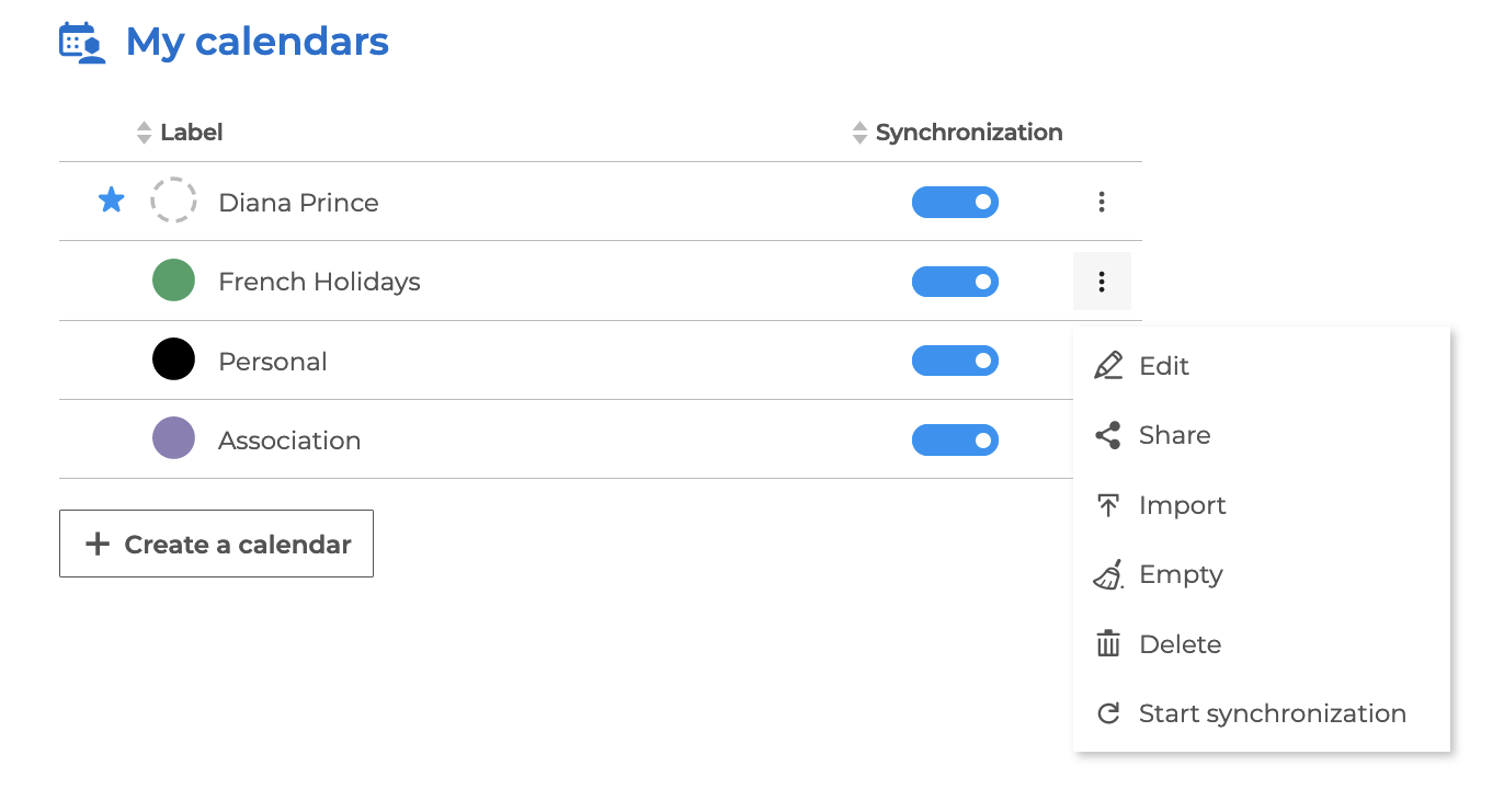 To modify, empty or delete a personal calendar, click on the calendar action menu :