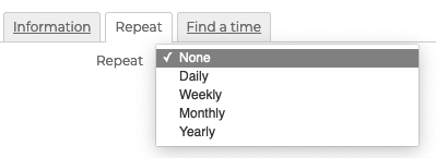 To schedule a recurring event, go to the Repeat tab and choose how often you want the event to repeat: every day, week, month or year.