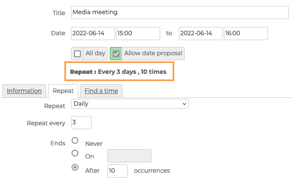 For events that occur on a regular basis - e.g. a monthly meeting - the BlueMind Calendar lets you create the event once and set a start, end and repeat frequency. You can then edit one occurrence or the entire series.