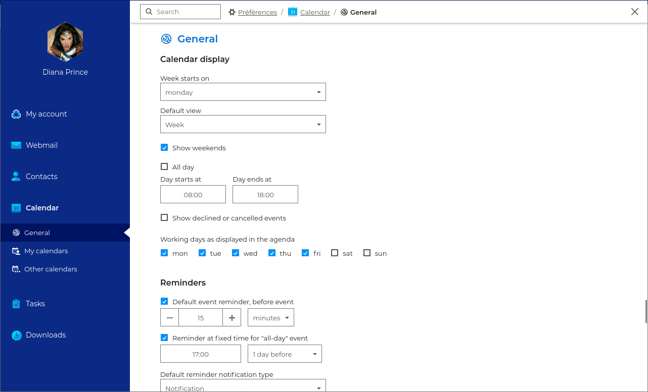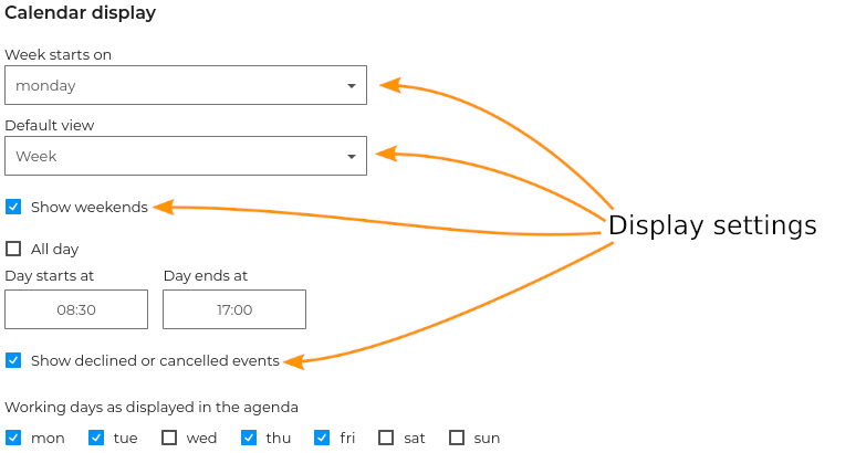 You can choose your display, time management and reminder preferences in your general Calendar settings.