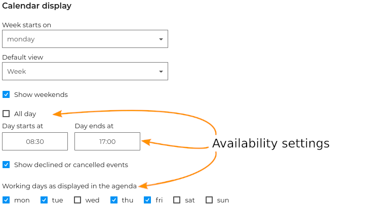 Default day start and end times as well as working days are used to set the time periods BlueMind will consider as working hours.