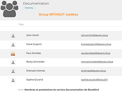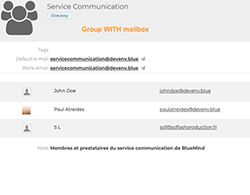 | USER GROUPS A group brings together several users with common needs or objectives. ![]() ![]() | Address book : Groups are created by the administrator and are part of the Directory You can: - Organizing Meetings with or without videoconferencing and send an invitation to all group members - display the agenda of all group members - Creating and Sending a message to all group members with an e-mail address, who will then receive messages on their own e-mail address. Cannot: - send e-mail to members of a group without an e-mail address. |