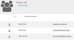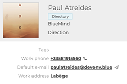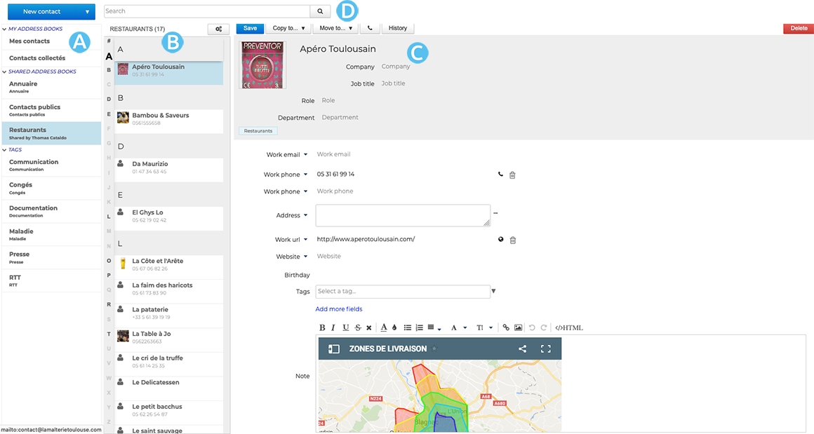 : in the 1st column, under the "New contact" button, you'll find the list of address books accessible by the user (personal address books and those to which he/she has subscribed), as well as the list of tags, enabling you to quickly find indexed contacts (see below)