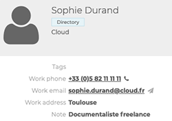 It is also possible to send a message or call a contact directly from their record, index contacts with tags, create distribution lists, share contacts between groups or users and access a company address book.