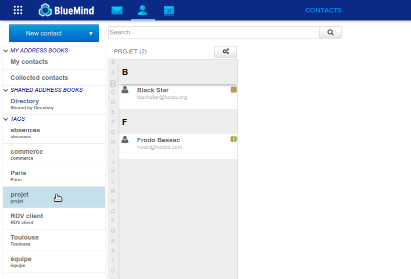 You can access the Contacts application from the main BlueMind navigation ribbon.