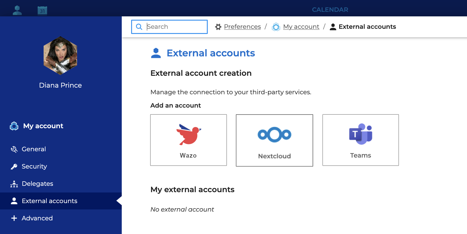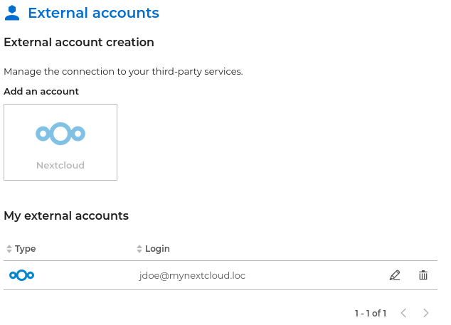 To configure the connection to an external account, go to Preferences > My account > External accounts: