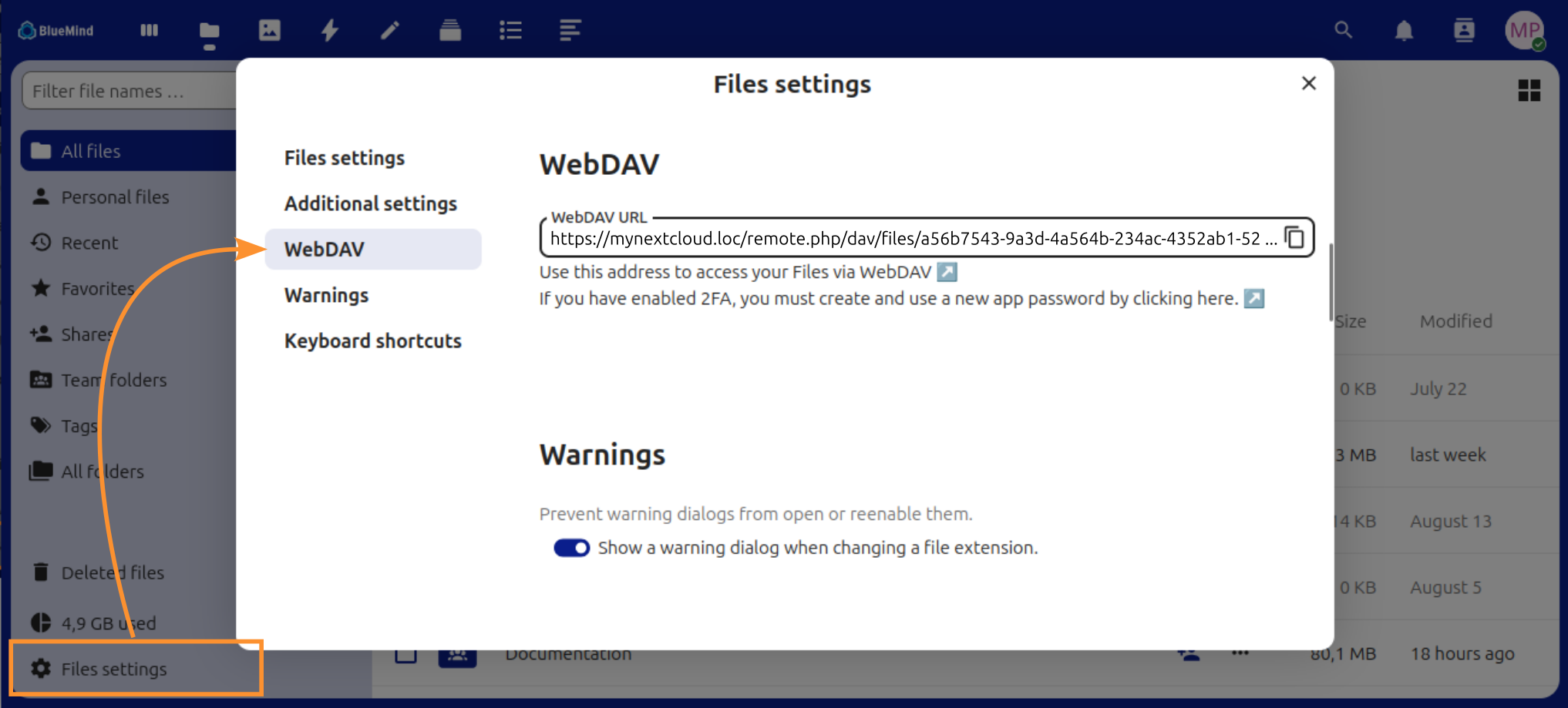 It is then necessary to specify the WebDAV URL, which can be found in the Files settings of the user's Nextcloud space: in Nextcloud, position yourself on the Files application and go to Files settings > WebDAV: