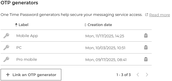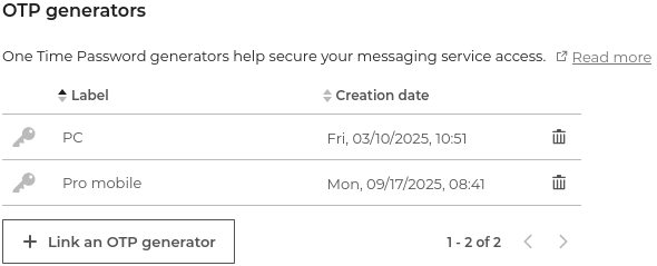 To view, delete or create new keys, go to the preferences section My Account > Security > OTP Generators :