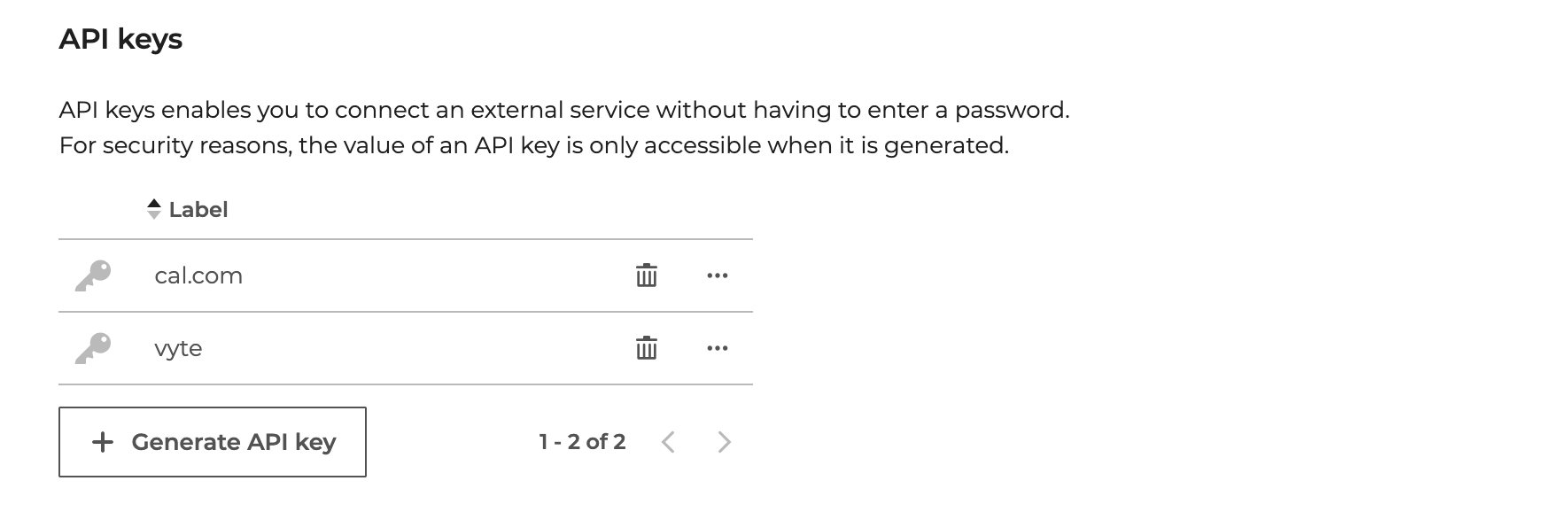 API keys can be used to connect to a user account without using the account login password. In particular, they enable you to connect an external service without having to provide it with the user password, and to revoke access at any time by deleting the key.