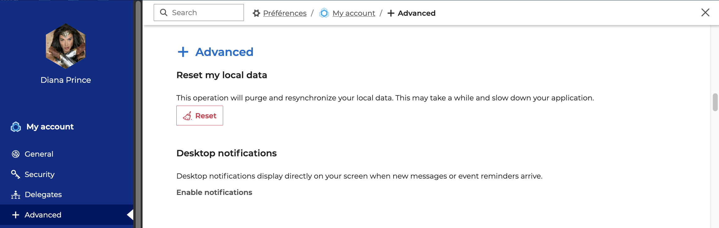 The "+ Advanced" section of the user account preferences gives access to the application's reset local data and enable notifications:
