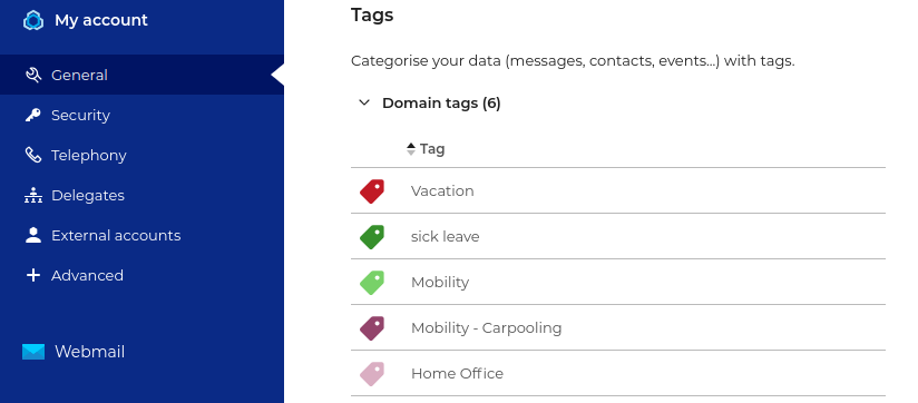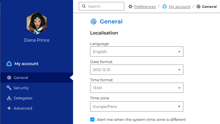 Each user can customize their BlueMind interface. In particular, he can choose the language or create delegations.