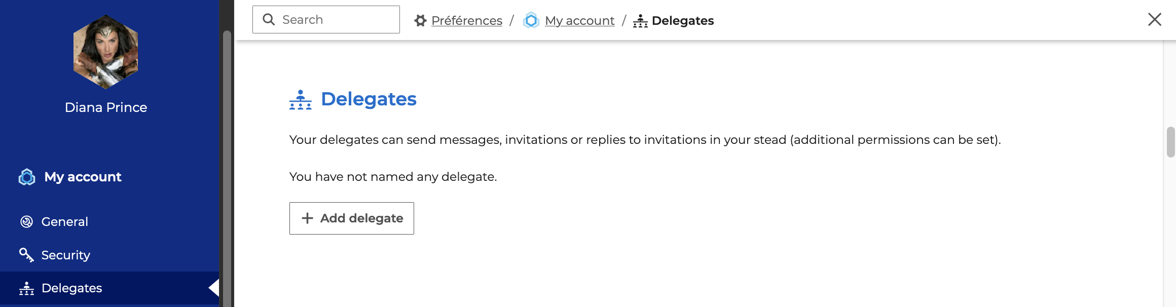 As soon as at least one delegate is created with the "Receives and responds to invitation messages" option, an additional setting is displayed under the delegation summary table, allowing the delegate to choose whether or not he/she also wishes to manage his/her invitations:
