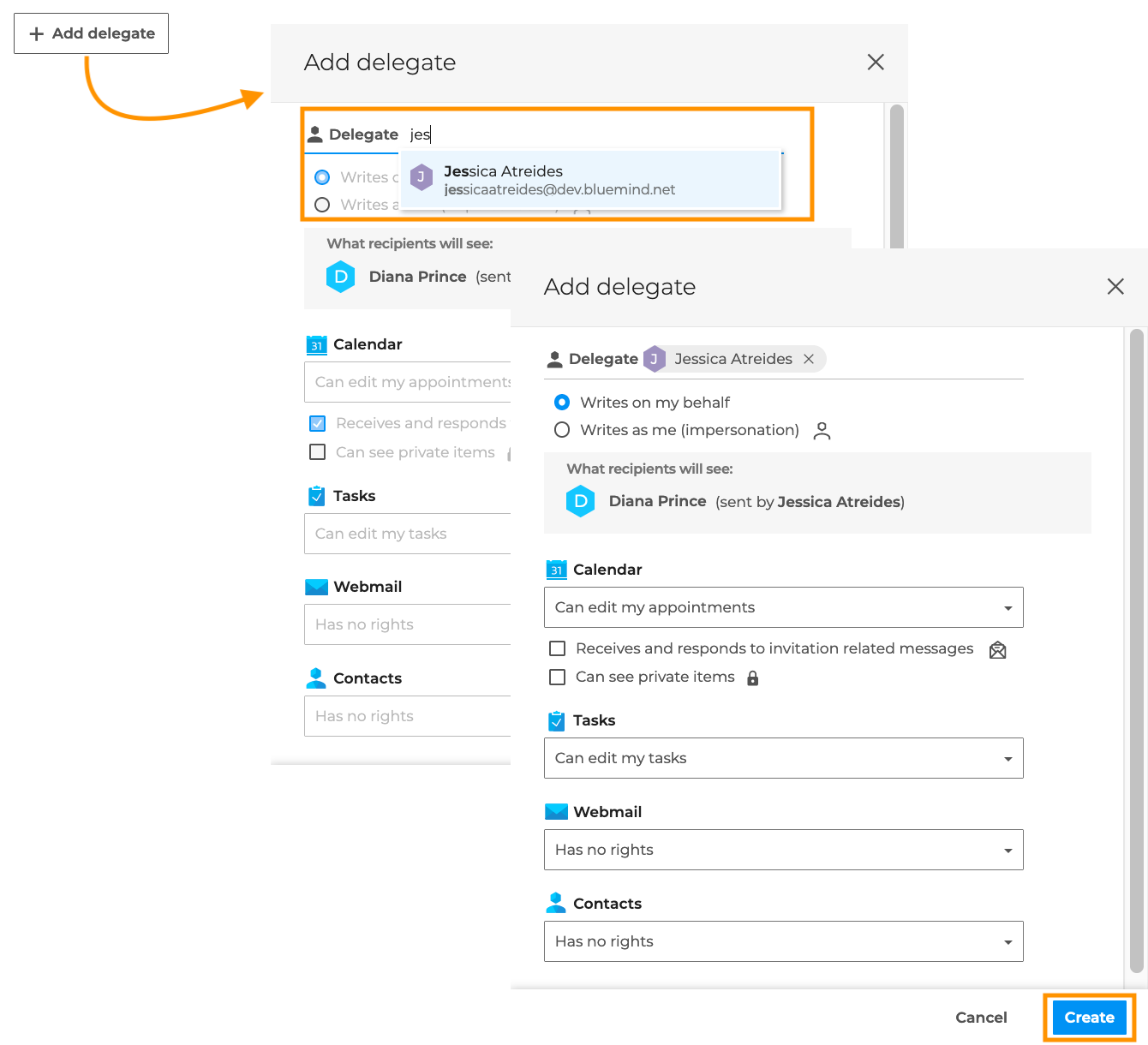 - Add a user or group in the "Delegate" field: type the first few letters and choose from the autocomplete list.