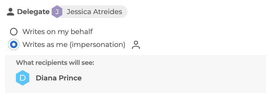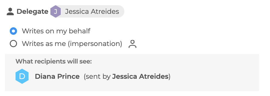 A delegation allows a delegated user to send emails using the delegating user's email address. The first parameter to set is the desired level of customization. Depending on the option selected, the recipient may or may not see that the email has been sent by a delegate.