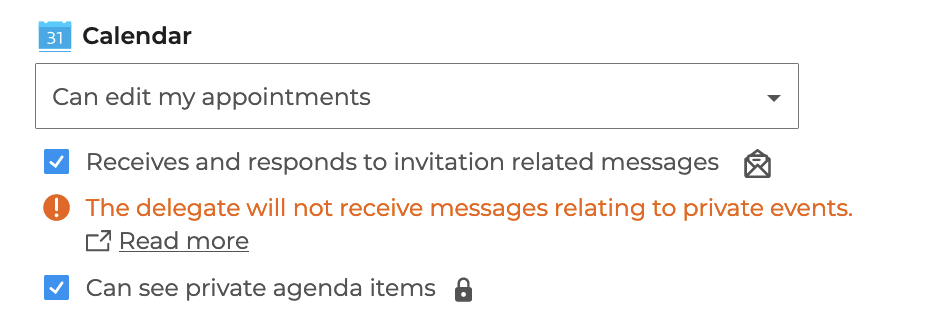 An additional right can be granted to the delegate to see and manage private events from the Calendar. To do this, also tick the option "Can view private events in the Calendar".
