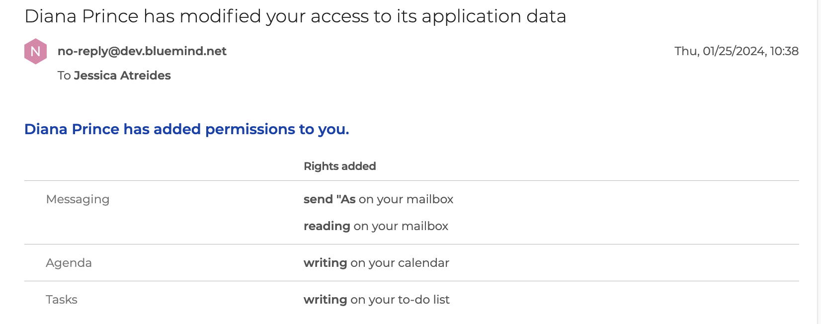 Once the delegation is created, the delegate receives an email notification summarizing the rights granted to them :