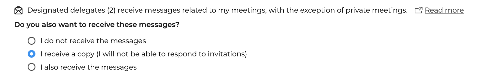 - I receive a copy: both the delegate and the delegator receive the invitation, but only the delegate can manage the invitation; the delegator receives a read-only copy of the invitation and can see the delegate's response in the date icon: