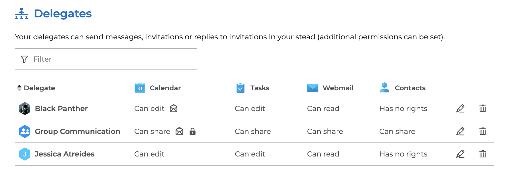 Once delegations have been created, a table summarizes all the delegations and rights granted to each delegate :