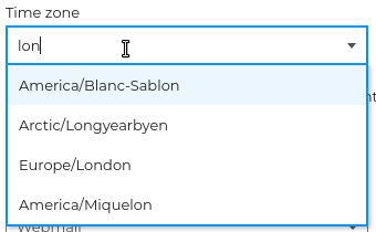 The time zone: select and clear the text to see all available time zones, or type the first letters of the country or city to search for a time zone: