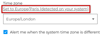 When the chosen time zone is different from that of the system, a link allows you to easily bring it into line: