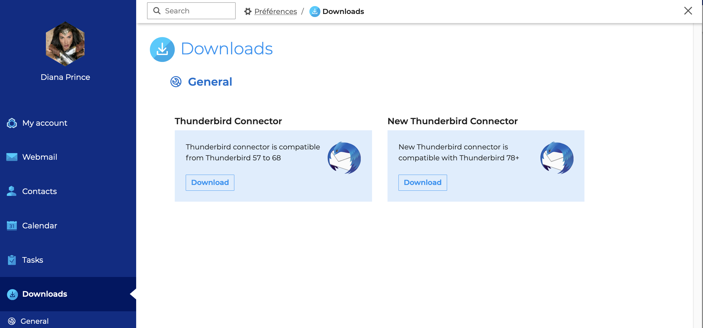 The Downloads section allows users to download the Thunderbird connector provided by BlueMind to synchronize their software.