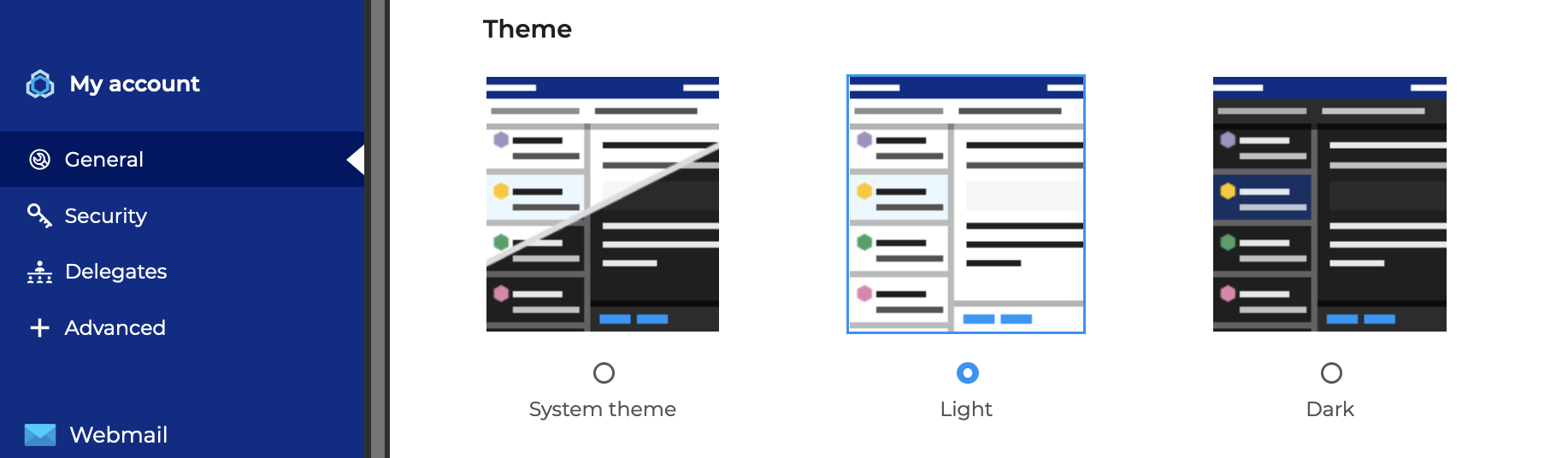 The theme allows you to display the mailbox in light mode or in dark mode. By checking the System theme option, the display adapts to the mode defined in the computer settings.
