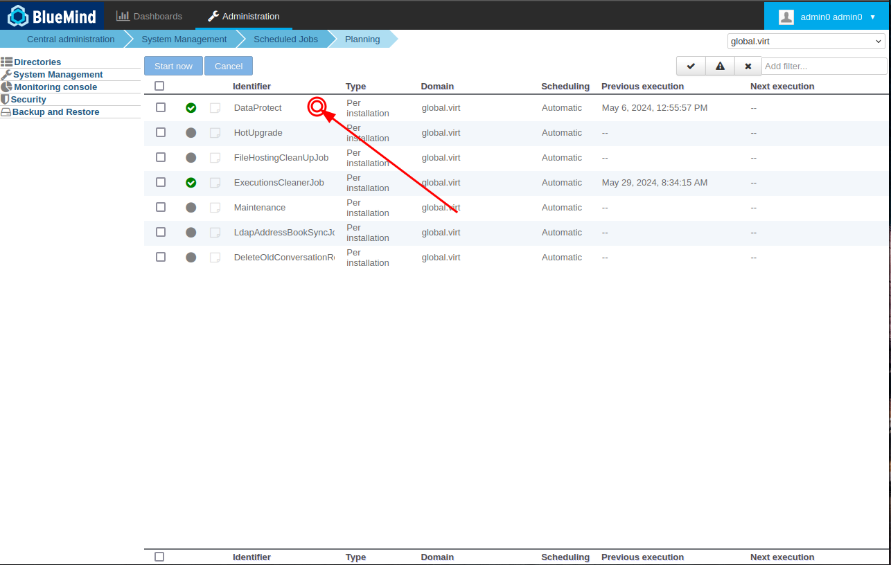 Connected to the server via ssh, perform a grep on the BlueMind main log file /var/log/bm/core.log: