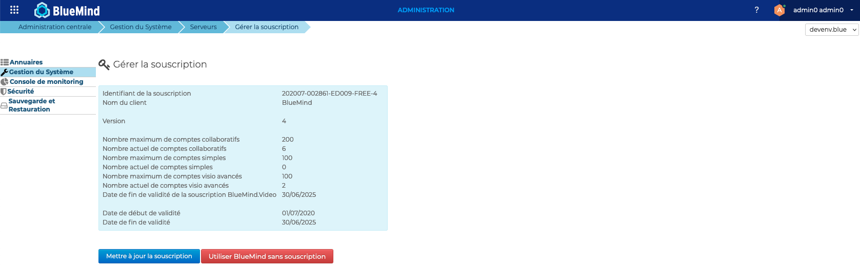 - Redémarrer BlueMind pour faire prendre en compte la nouvelle souscription