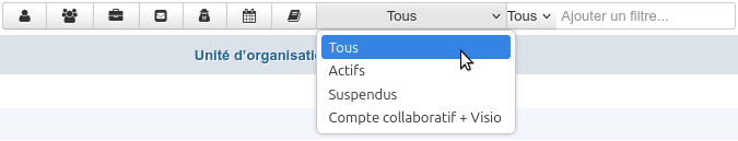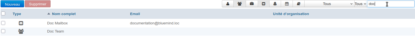 - Type d'entrées : Les 7 premiers boutons permettent d'afficher ou masquer un type d'entrées : utilisateurs, groupes, ressources, boites partagées, utilisateurs externes, calendriers, carnets d'adresses.