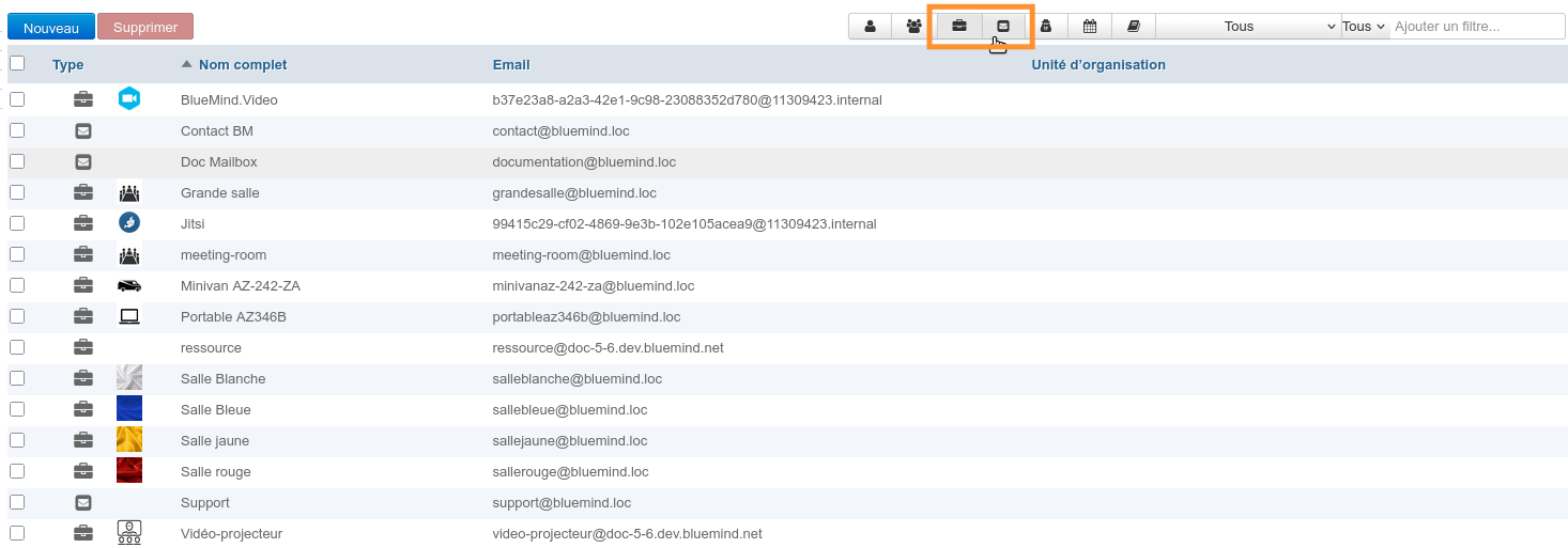Lorsqu'un bouton est activé, il apparaît grisé et les entrées correspondantes sont affichées. On peut ainsi faire apparaître un ou plusieurs types d'entrées en activant un ou plusieurs boutons, par exemple pour visualiser les ressources et les boîtes partagées :