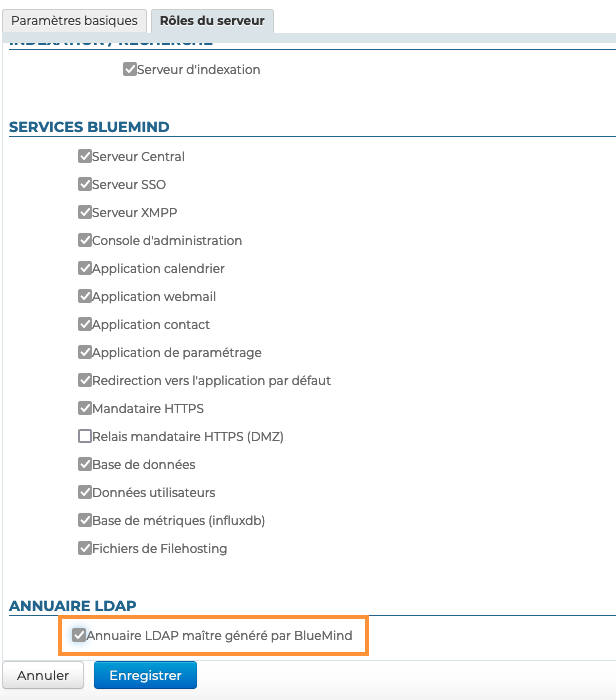 - dans la section "Annuaires", cocher « Annuaire LDAP maître généré par BlueMind » :