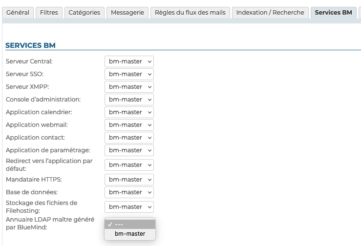 - sélectionner le serveur pour le service de même libellé « Annuaire LDAP maître généré par BlueMind » :