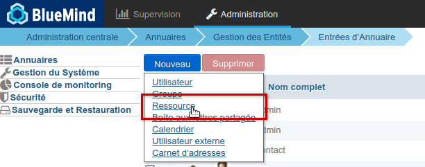 Depuis la page d'accueil de la gestion des Annuaires, cliquer sur "Créer une ressource" ou depuis la liste des entrées d'annuaire utiliser le bouton Nouveau > Ressource :