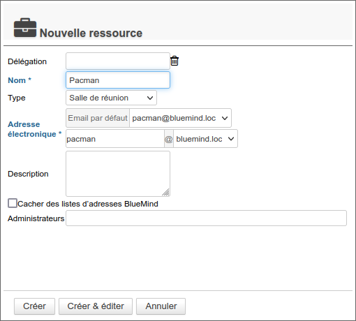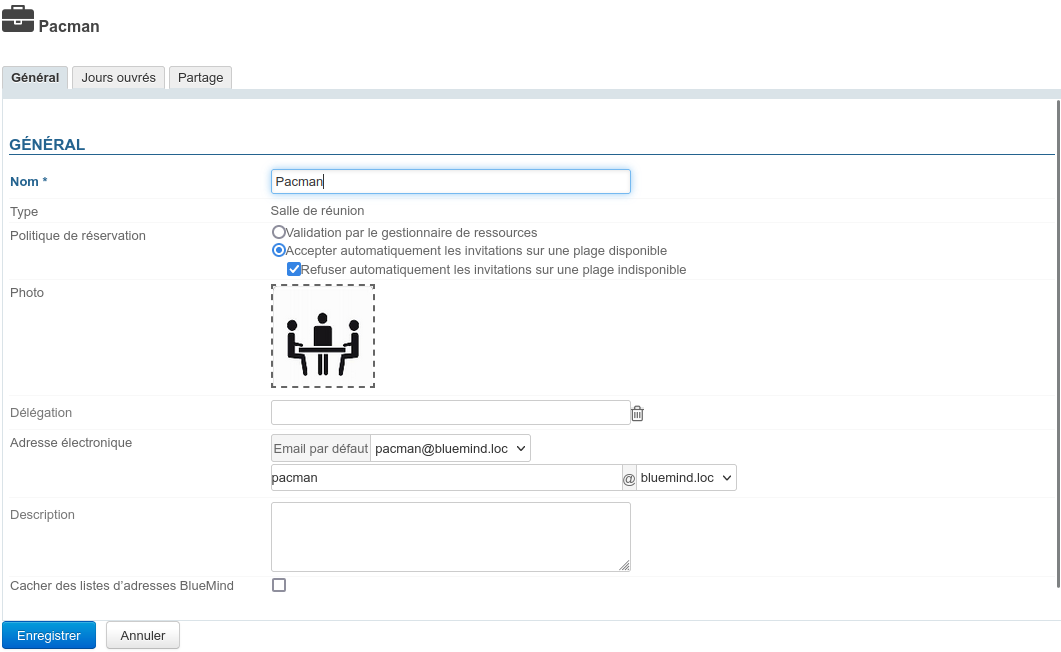 - Adresse électronique : les adresses de courrier sont utilisées par le calendrier pour envoyer les invitations et mises à jour d'événements mais les ressources ne possèdent pas de boîte de messagerie associée, il n'est pas possible de leur envoyer de message
