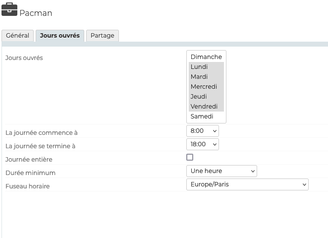 L'onglet "Jours ouvrés" permet de définir des jours et horaires de disponibilités de la ressource, ainsi que la durée minimum pour laquelle elle peut être réservée (1 h, 2 h, demi-journée, journée) et son fuseau horaire :