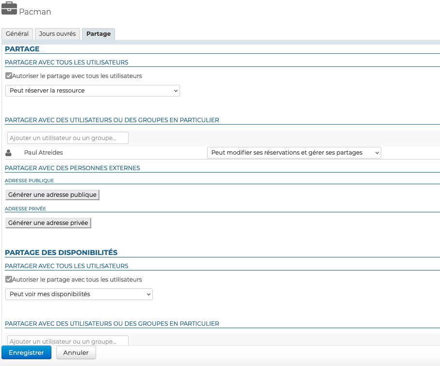 De même que pour les utilisateurs, cet onglet permet aussi de partager le calendrier avec l'extérieur et de gérer le partage des disponibilités.